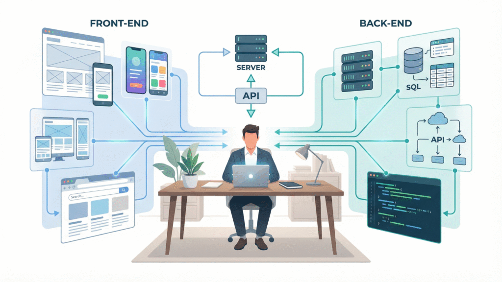 Full Stack Development means building a complete website or a software application that includes everything that users see and everything that runs behind the scene.